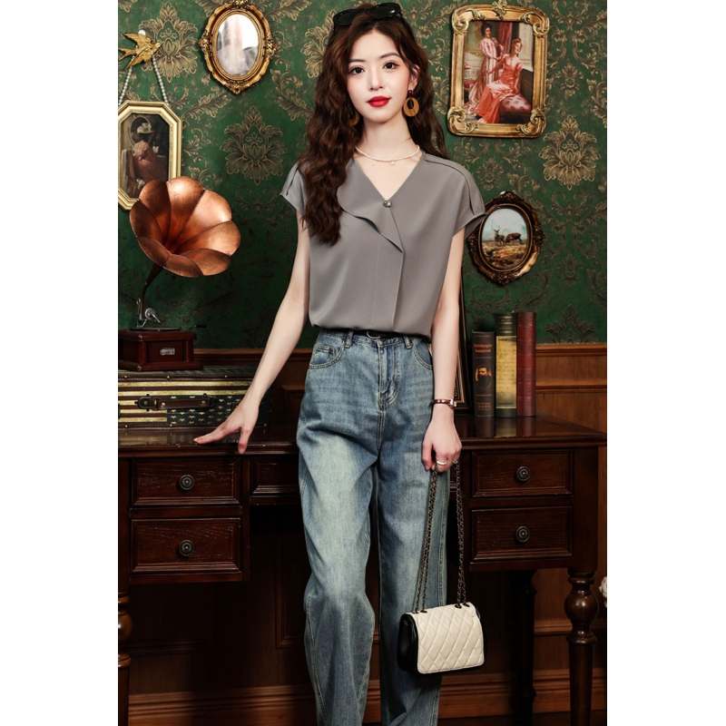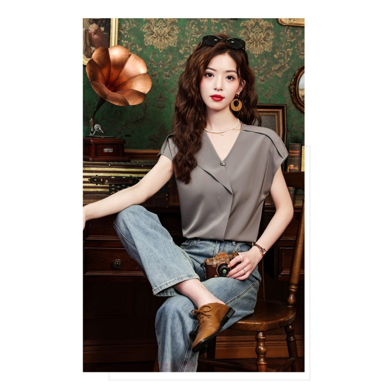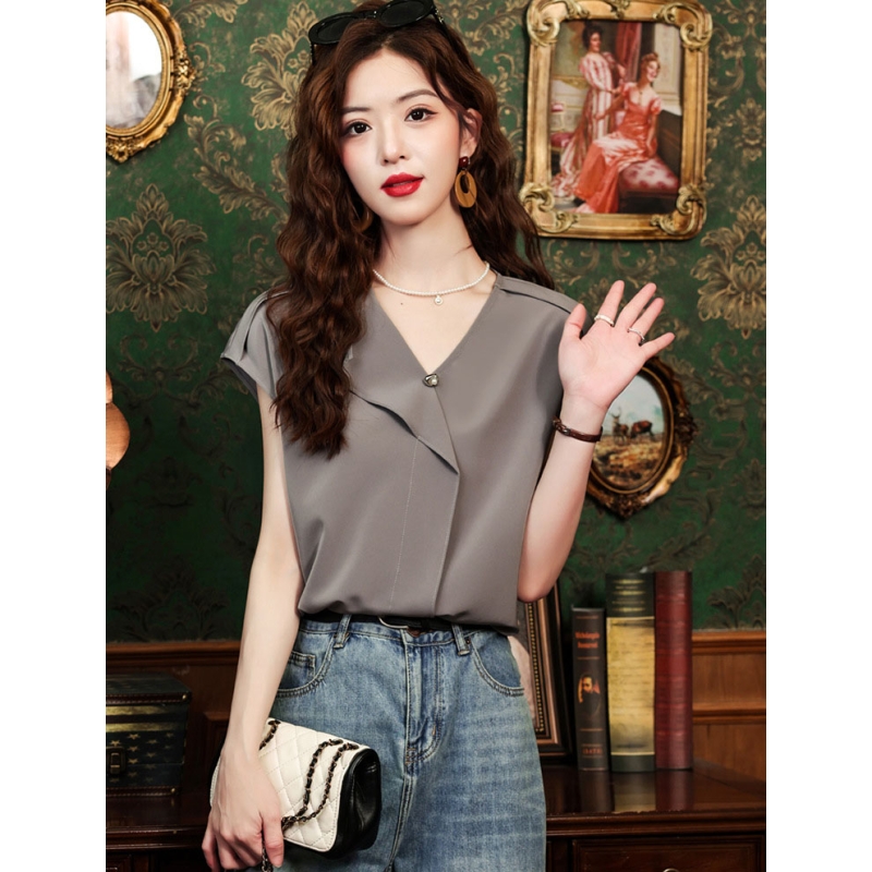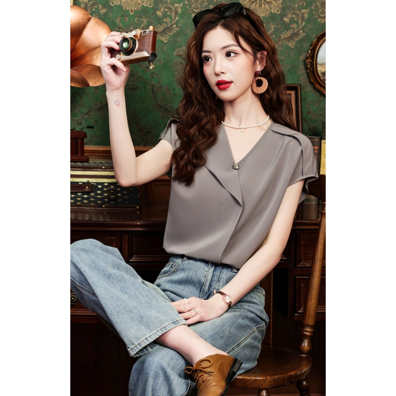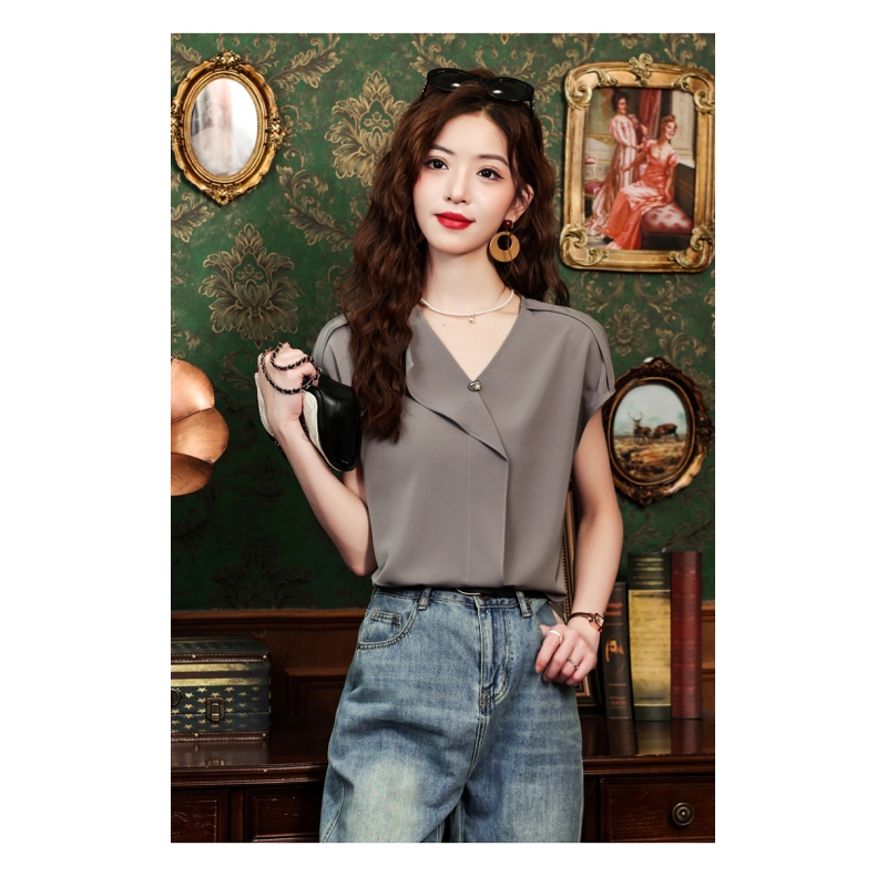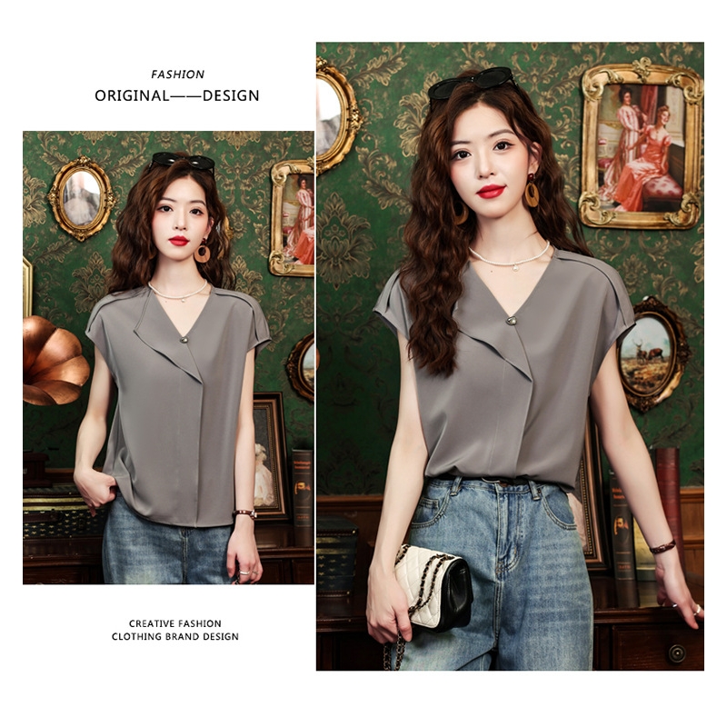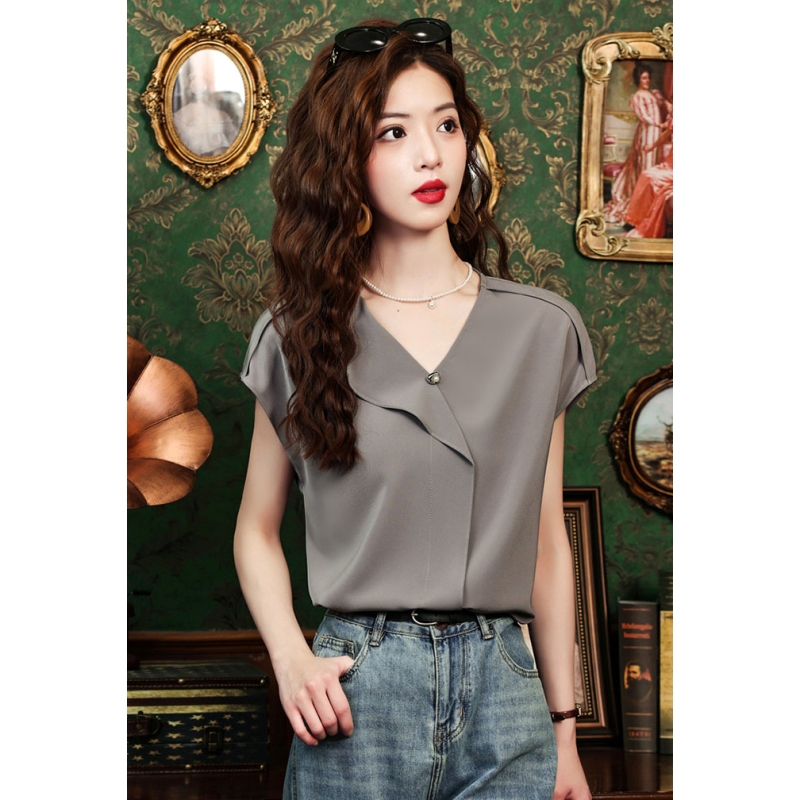 blouse wanita v-neck lengan pendek import T8759